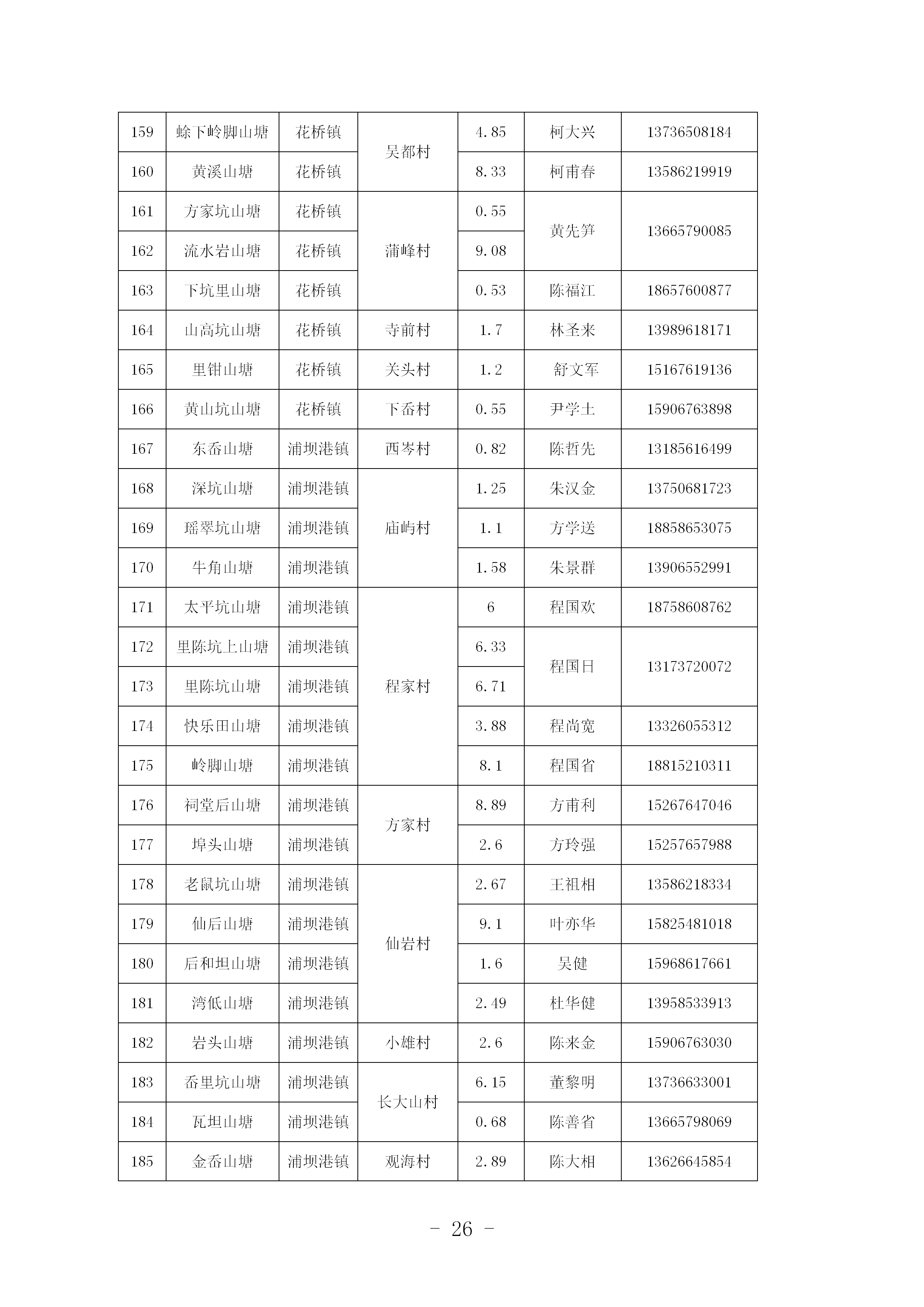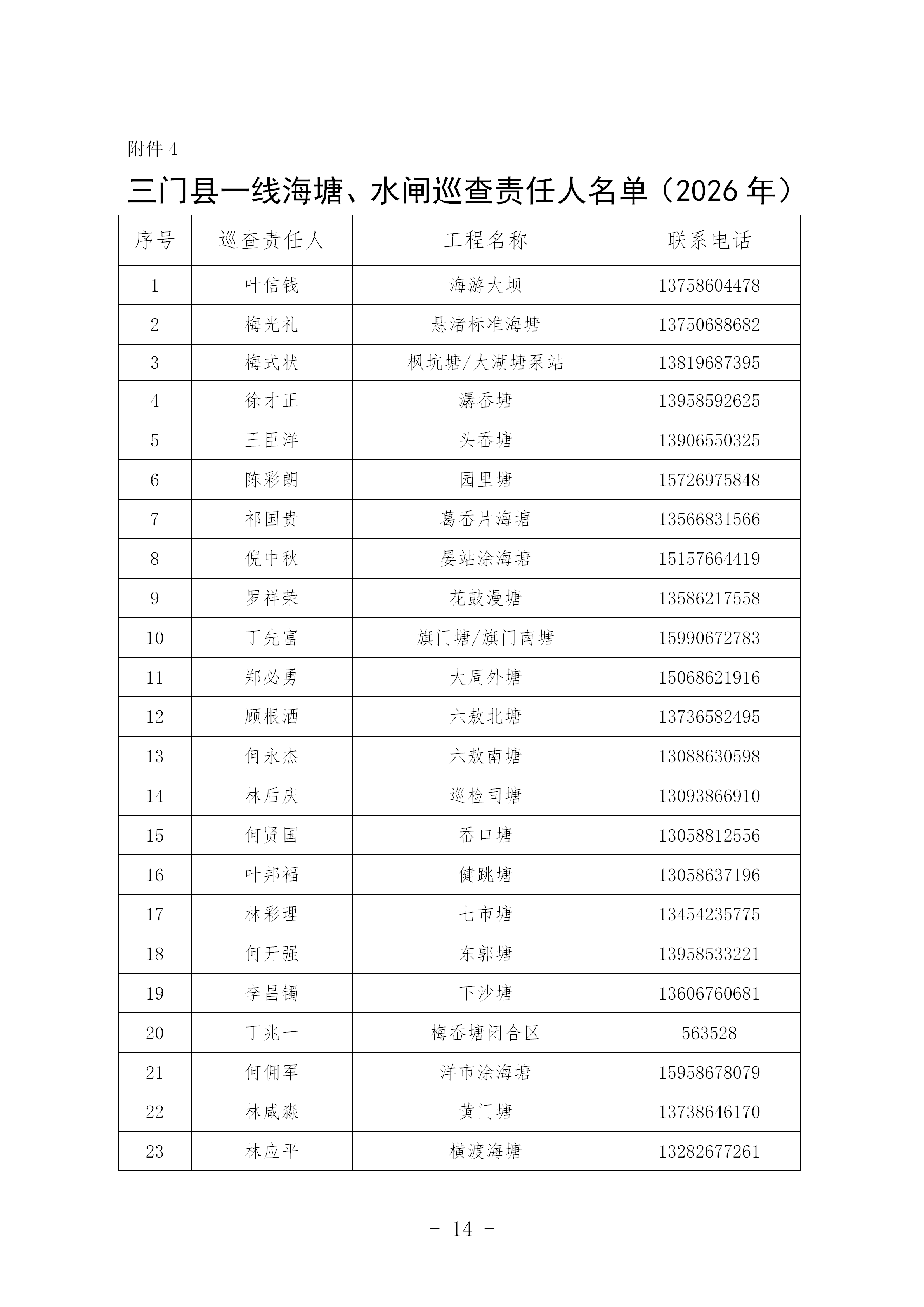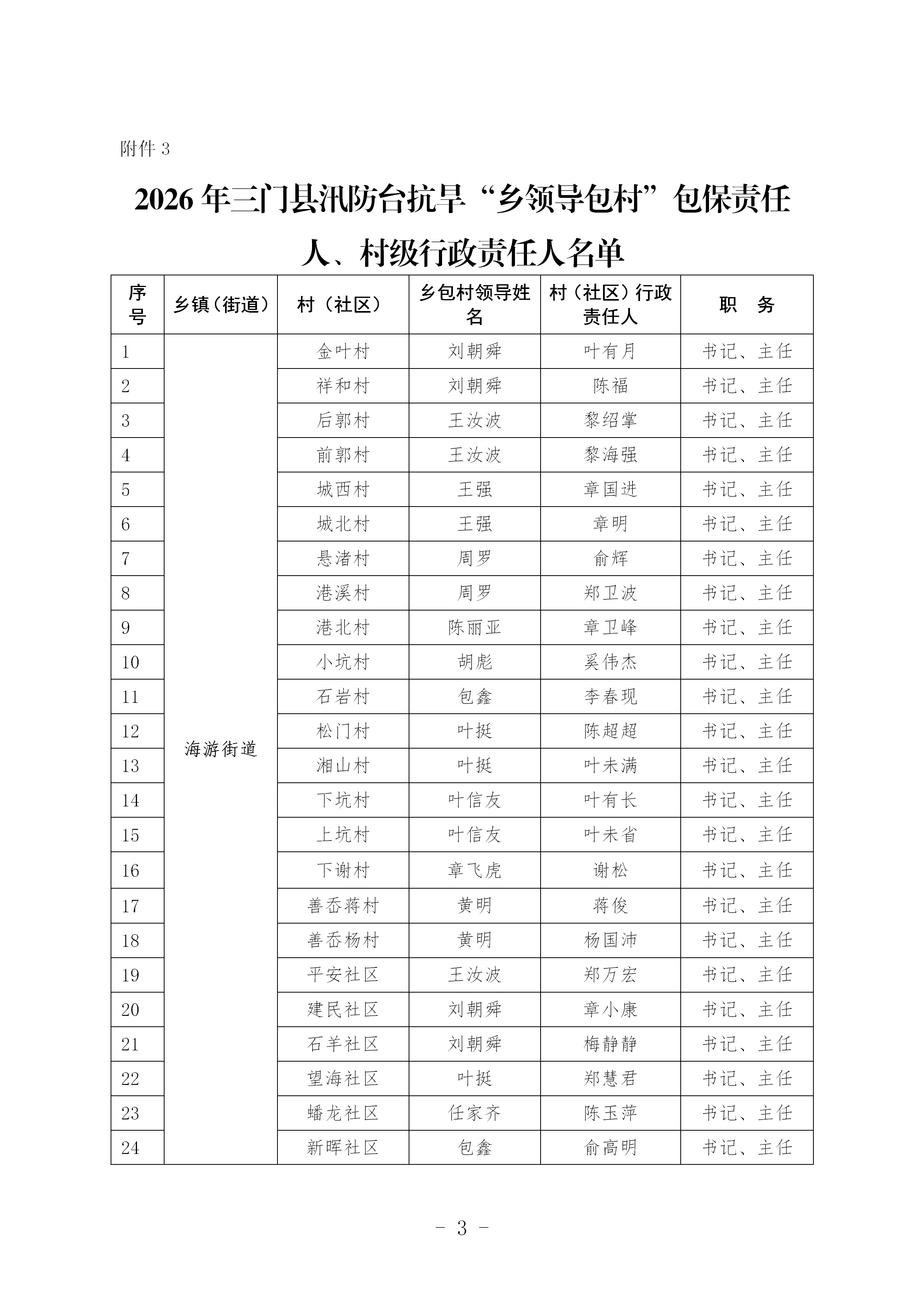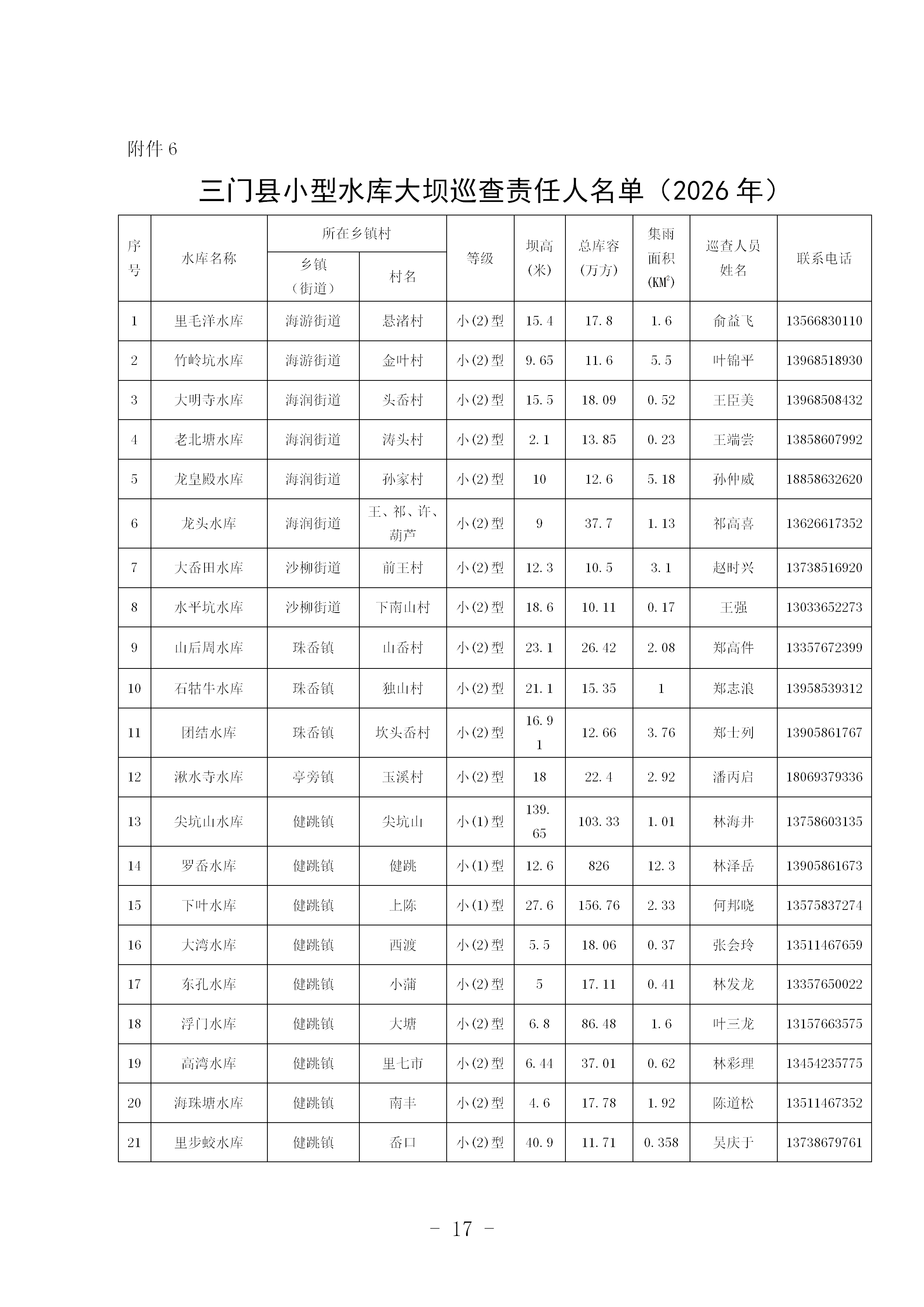 为做好2026年度基层防汛防台体系管理工作,根据《中华人民共和国防洪法》、《浙江省防汛防台抗旱条例》等法律法规和省防指有关文件要求,落实以行政首长负责制为核心的各项防汛防台抗旱责任制,现将我县中型水库大坝安全管理责任人、2026年三门县防汛防台抗旱行政责任人、2026年三门县汛防台抗旱“乡领导包村”包保责任人、村级行政责任人等名单予以公布。如遇责任人变动,新任者即为责任人。