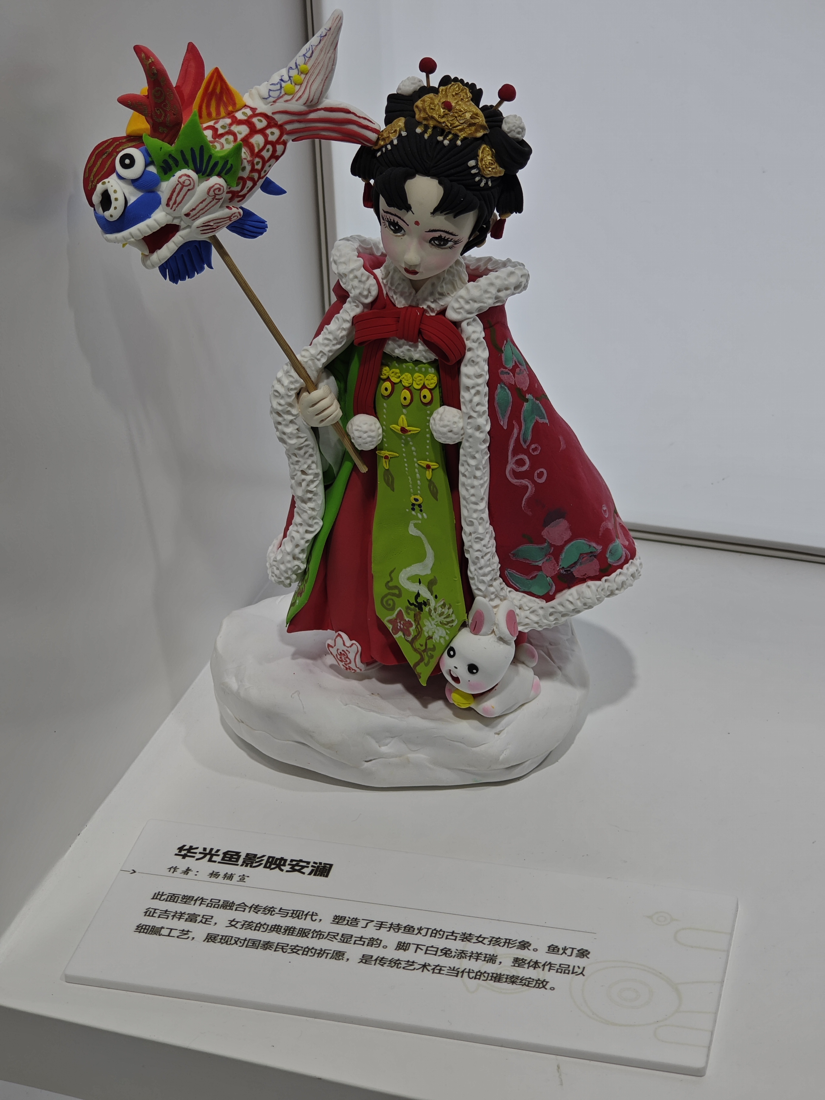 创作者为三门工匠杨辅宣。大学毕业后,为传承和发扬面塑的非物质文化遗产,他子承父业,对面塑的立体构造独具匠心。作品巧妙融合传统与现代元素,塑造出一位手持鱼灯的古装女孩形象——鱼灯象征吉祥富足,女孩典雅服饰尽显古韵,脚下更添祥瑞之意,让传统鱼灯在当代展馆中“活”了过来。