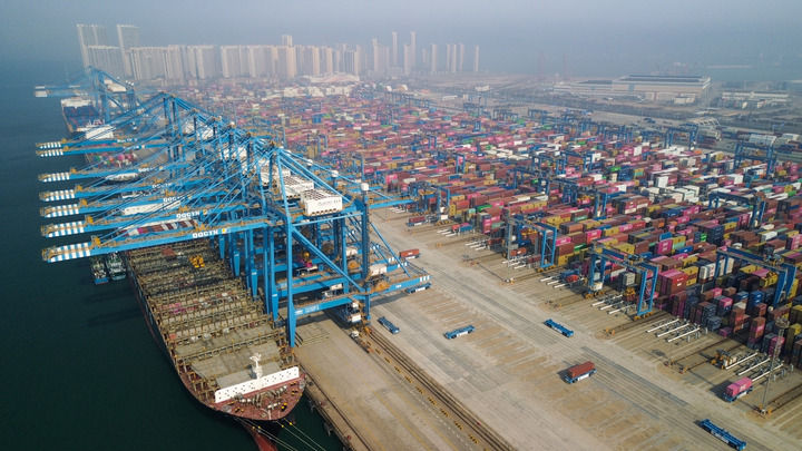 正在进行集装箱装卸作业的山东青岛港全自动化集装箱码头(2026年3月25日摄,无人机照片)。新华社记者 徐速绘 摄