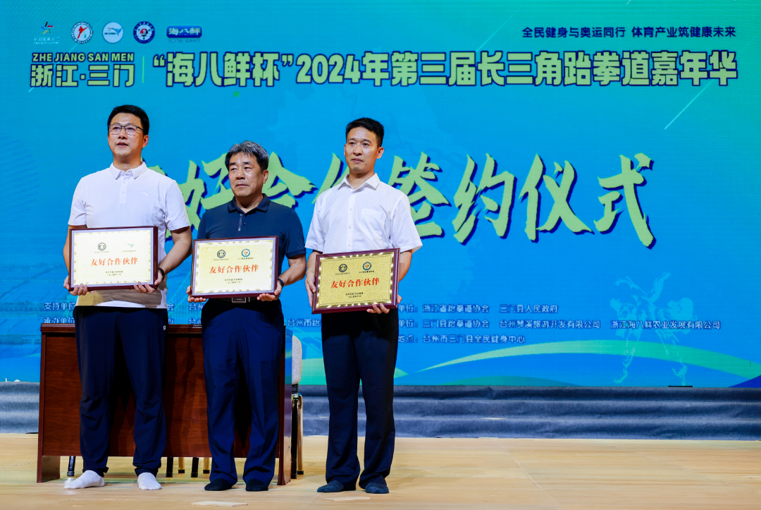 当晚,现场所有观众还一起见证了由韩国忠北保健科学大学跆拳道队分别与三门县跆拳道协会、台州市跆拳道协会签署的友好合作交流协议。协议的顺利签署,意味着今后两地间跆拳道交流与合作将会日趋频繁。