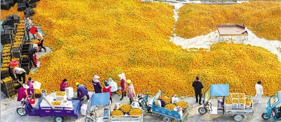 当前正值三门柑橘上市旺季,各地客商前来收购,帮助果农实现就地销售。图为浙江省三门县浦坝港镇圩岙村的收购现场,果农们忙着交易。林利军/摄