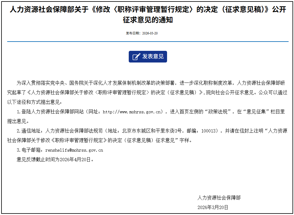 《征求意见稿》中,将第十七条修改为:“非公有制经济组织的专业技术人才和自由职业者等申报职称评审,合法权益受到同等保护,履行同等义务,其申报审核、公示、推荐等程序可以由所在工作单位或者人事代理机构等履行。具体要求由所在地人力资源社会保障行政部门规定。”畅通了非公领域人才和自由职业者职称申报渠道。
