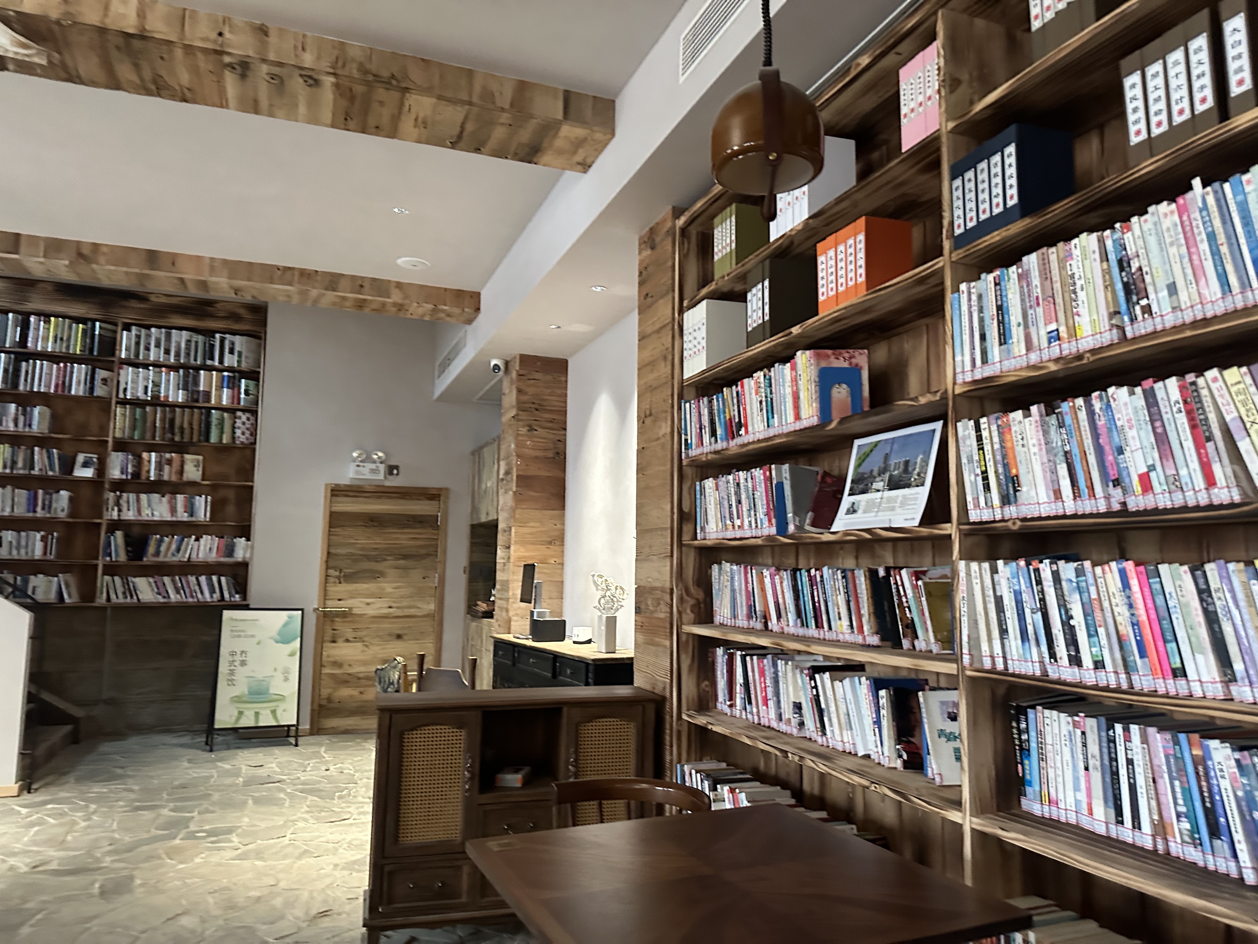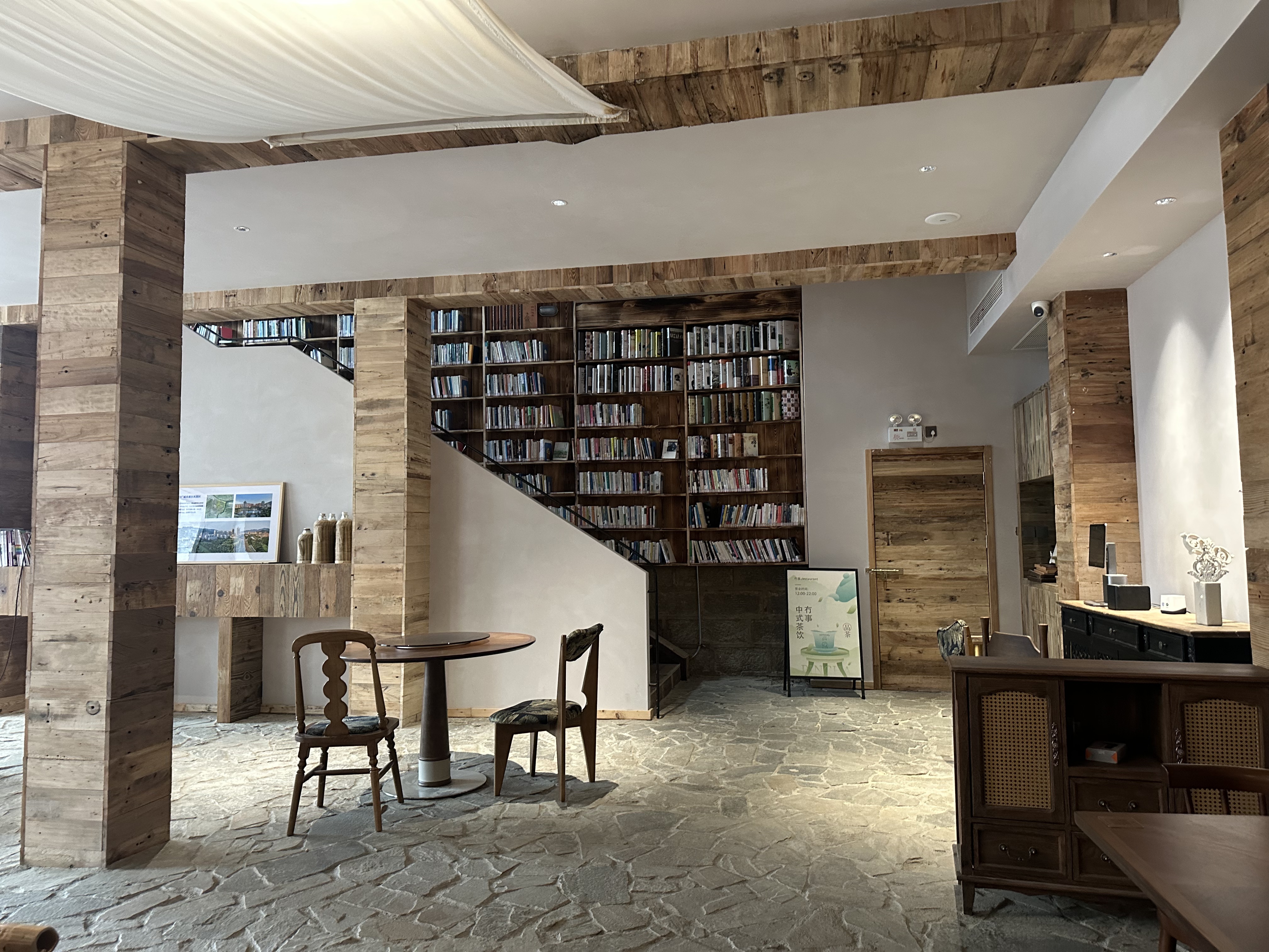 行至街区转角处,“冇事书咖”赫然入目。推门而入,这方古色古香的空间,像是森林书屋,造景、摆设取法自然,阅读在这里是件顺其自然的事。空间围绕“阅读体验”打造,满墙书架,随处可坐的位置,以及让人静心的室内设计,都能让来访者感受到,这是一个用心布置的读书空间。
