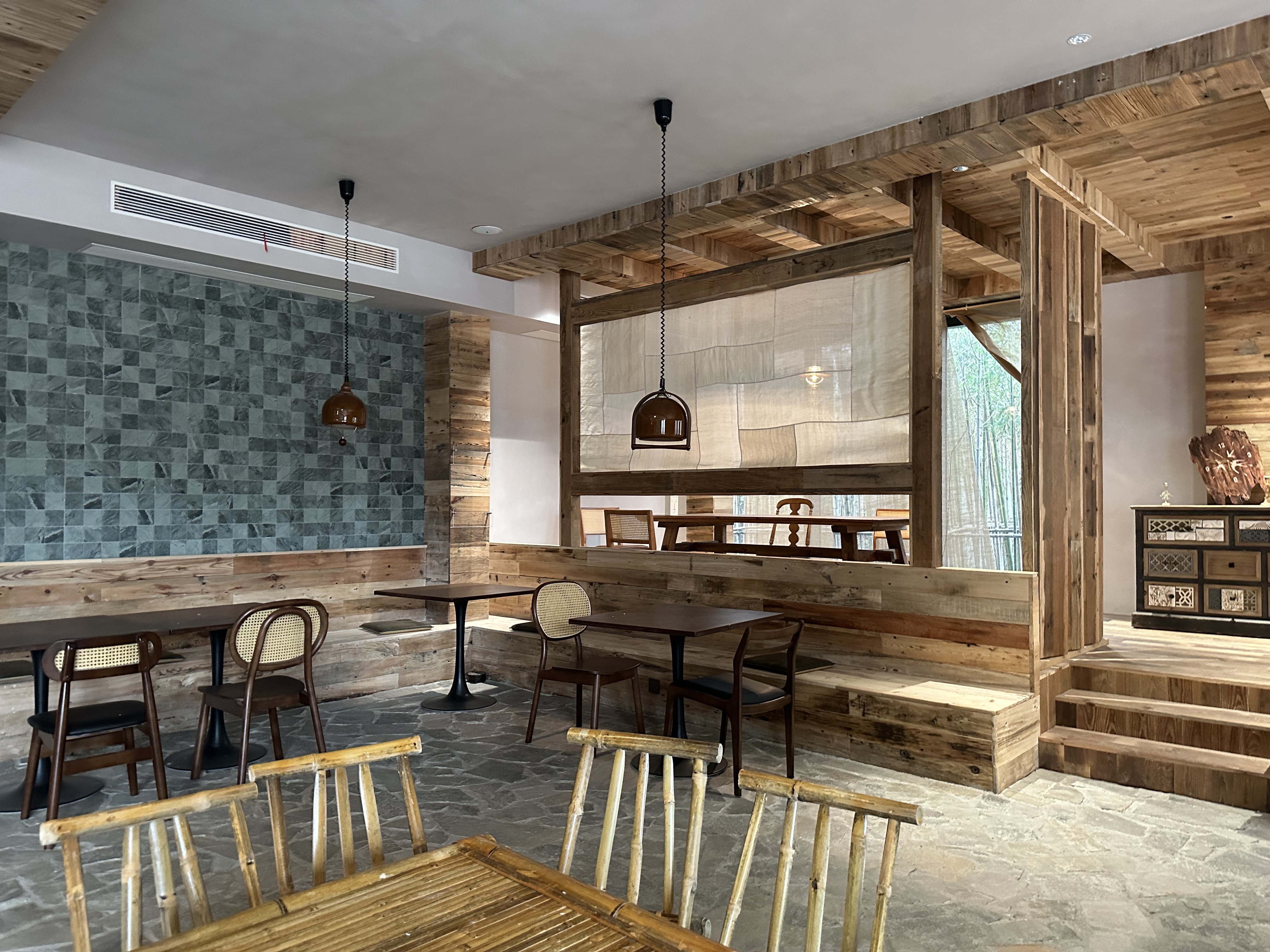 如果有“半日闲”的时光,来冇事书咖是不错的选择。从外观到内里,冇事书咖透着一股不事张扬的雅致。墙面多为素净底色,局部点缀着老砖、石质摆件,与街区青砖灰瓦遥相呼应。书咖里的造景、陈设多是原木材质,目之所及,木梁、竹凳、木构等都带着自然野趣。