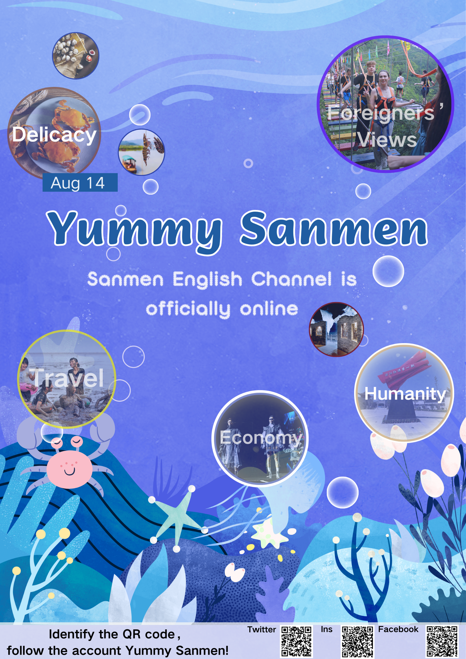 Adhering to the communication concept of "Meet Sanmen, Taste fresh and sweet", the channel focuses on the natural scenery, delicacy, culture and economy of Sanmen, to attract foreign users to know Sanmen and understand China. This channel will telling heartwarming stories happening on the land of Crab Town, stimulating emotional resonance and promoting connectivity. And to provide fresh and timely, rich and practical information services, as well as providing daily convenience for foreigners in Sanmen.