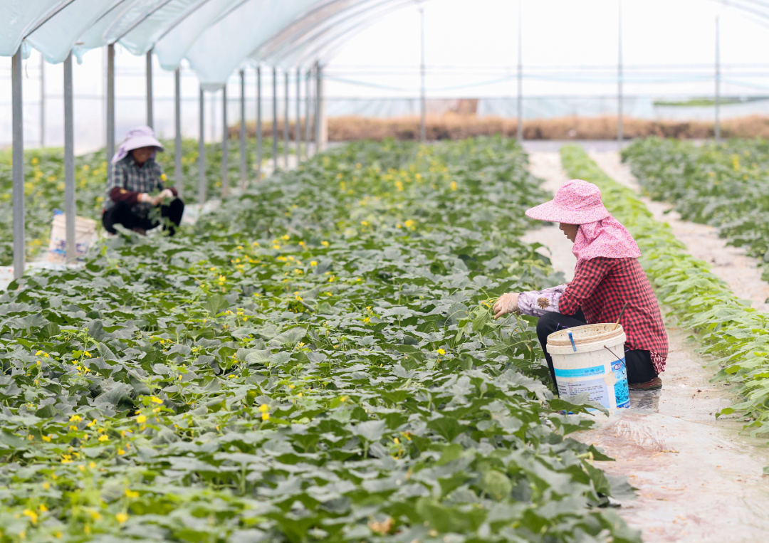 4月6日,三门学钗家庭农场里忙得热火朝天。工人们穿梭在翠绿的瓜田间,熟练地采摘甜瓜,再一筐筐搬运上车,准备销往广东。