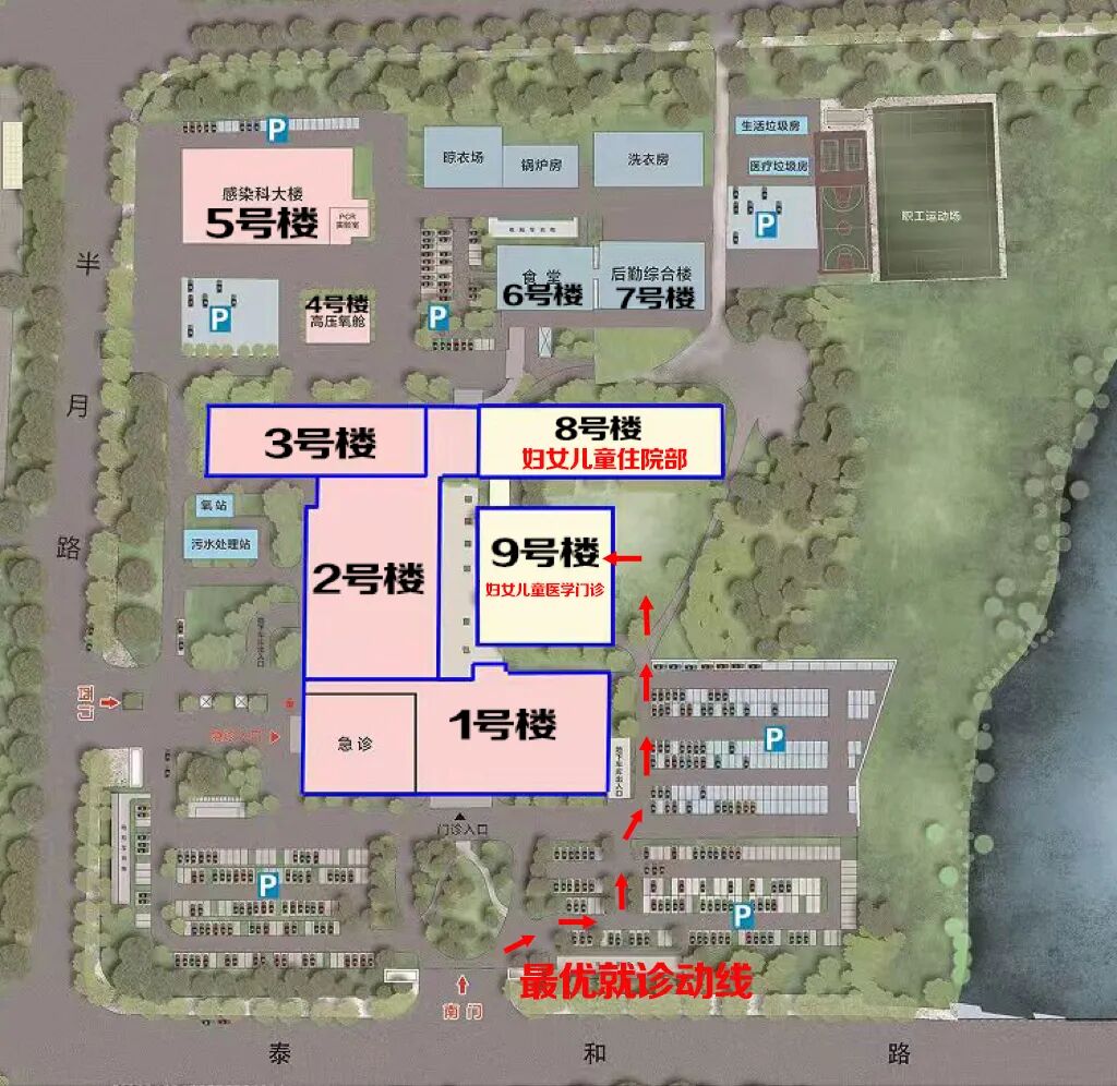①儿科就诊人员可根据上图红色路线指引快速进入妇女儿童医学门诊(9号楼)就诊。