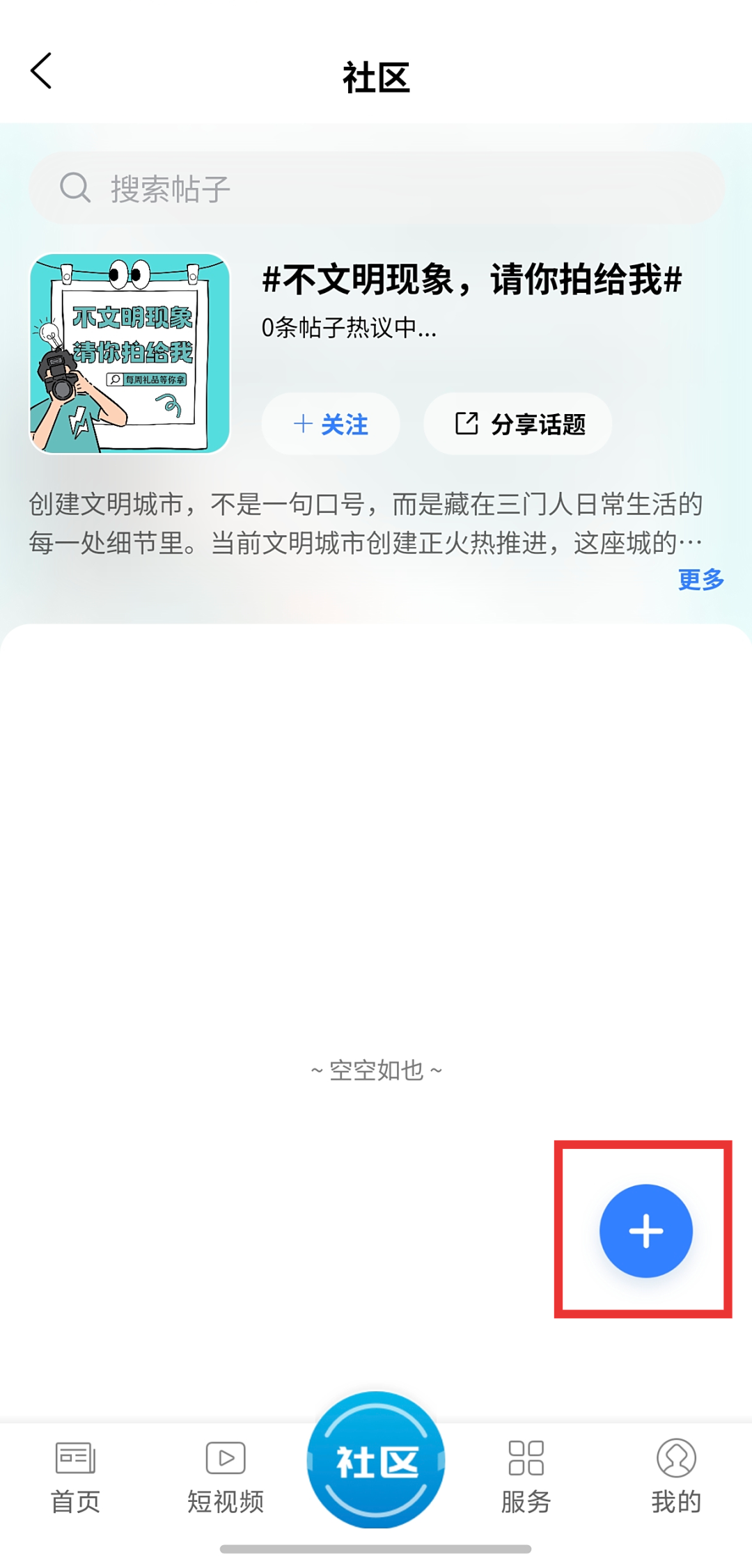2.进入社区板块后点击“更多”,选择#不文明现象,请你拍给我话题,点击右下侧“+”